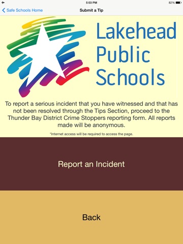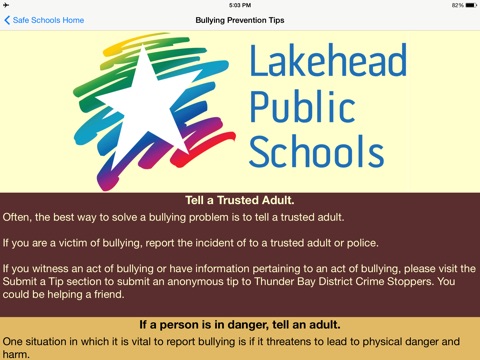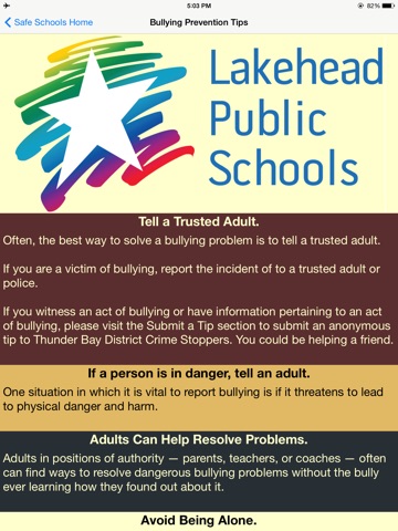 The Safe Schools App from Lakehead Public Schools promotes school safety. It is designed to provide students with resources, help, and safe and anonymous way to report bullying and other incidents that impact student safety in schools. Information is provided on how to get help with bullying, vandalism, drug & alcohol use, and other issues. This app includes a direct link to the Thunder Bay District Crime Stoppers anonymous reporting form.