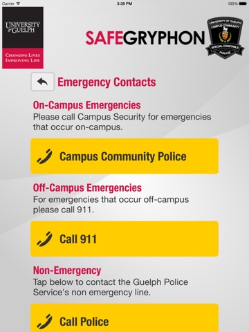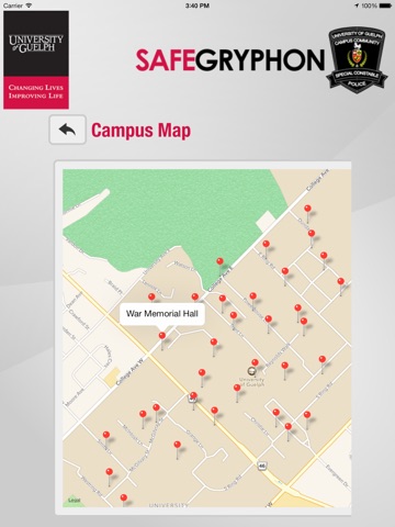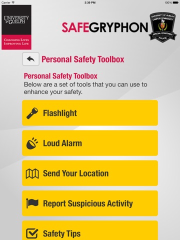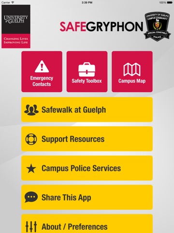 SafeGryphon is the official safety app of University of Guelph. It is the only app that integrates with U of Guelphs safety and security systems. University of Guelph Police Department has worked to develop a unique app that provides students, faculty and staff with added safety on the university campus. The app will send you important safety alerts and provide instant access to campus safety resources.