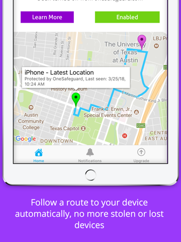 -Works silently on the background, tracking and syncing your device location, so you can follow your device if its ever misplaced or stolen. You can open onesafeguard.com from any device and view a map on where your phone has been, even if it has been turned off. Protect up to 3 devices with a same account.