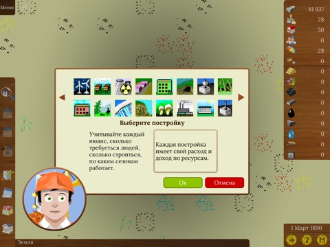 Вы можете создавать 33 вида строений.В некоторых клетках земли находятся определенные ресурсы (лес, вода, уголь и т.д.). Каждый день строения расходуют ресурсы и приносят прибыль. Некоторые строения могут работать только в определенные времена года.
