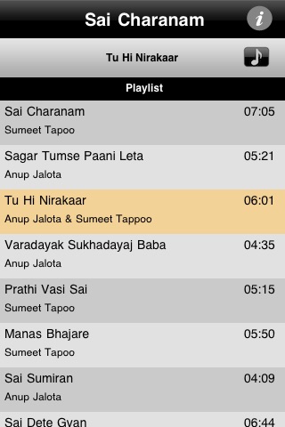 The music has been given by Abhinav Upadhyay and Sudeep Banerjee. Some of the tracks from this album includes Sai Charnam, Sagar Tumse Paani Leta, Tu Hi Nirakaar, Parthi Vasi Sai, Manas Bhajare, Sai Sumiran etc.