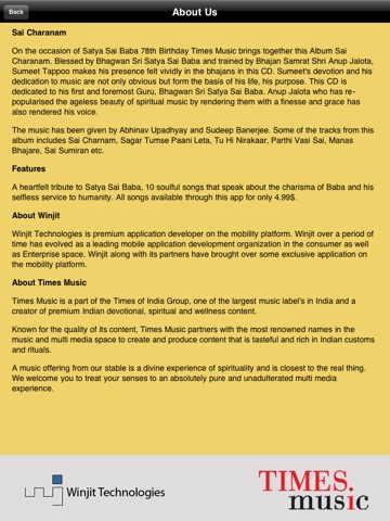 On the occasion of Satya Sai Baba 78th Birthday Times Music brings together this Album Sai Charanam. Blessed by Bhagwan Sri Sathya Sai Baba and trained by Bhajan Samrat Shri Anup Jalota, Sumeet Tappoo makes his presence felt vividly in the bhajans in this CD. Sumeets