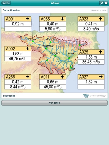 The information, which is updated in real time (hourly data for the general public and every quarter of an hour for the registered users), is shown through geographical maps (the whole basin or a specific piece of it) and in a numerical form in tables. It provides detailed information for more than 700 stations which complete the network (location, station sensors, images, schemes). It also shows trendlines for the different measurements as well as its numerical values. It contains a search engine in order to get the best access to the information by entering the station code or name.
