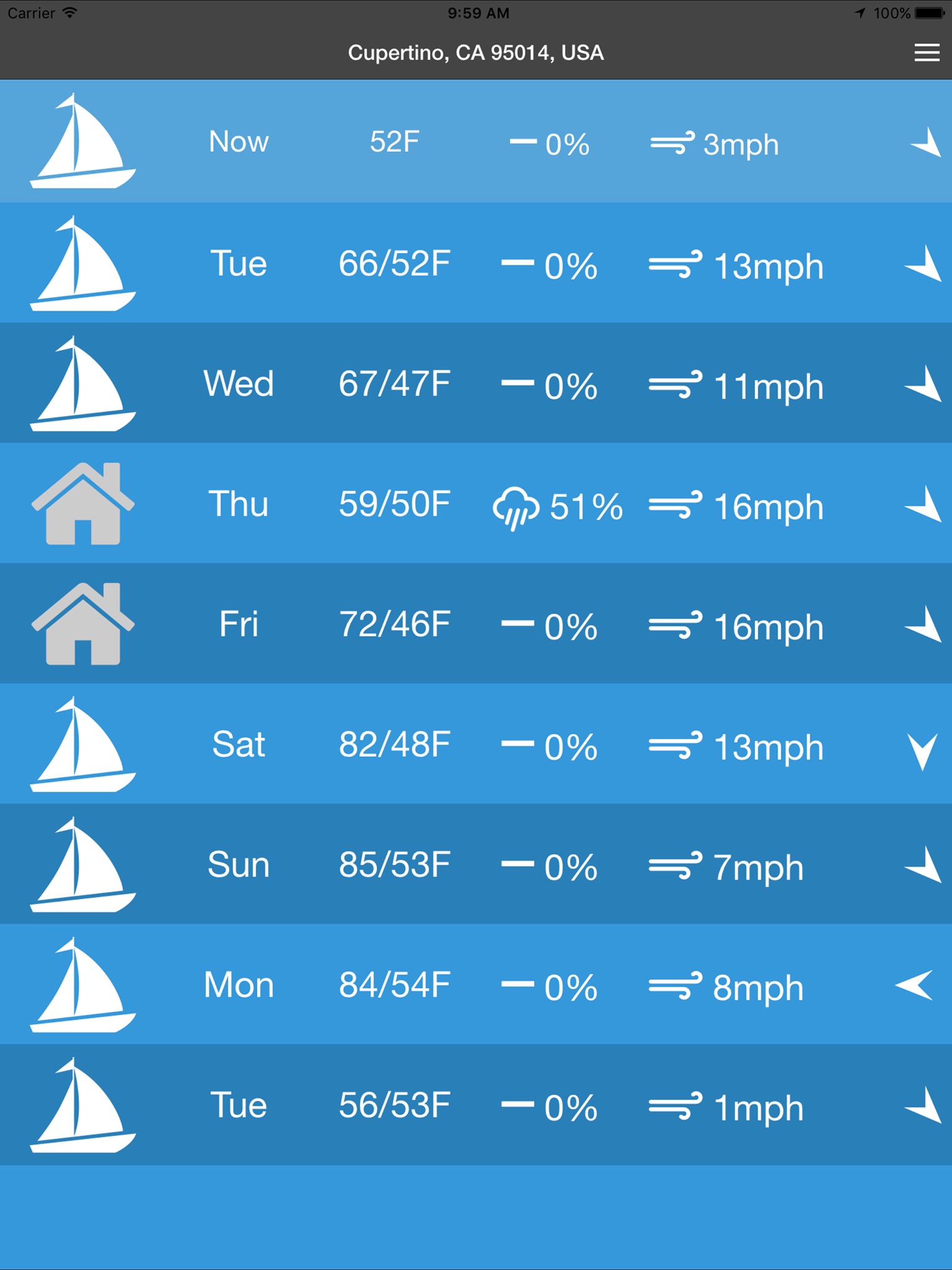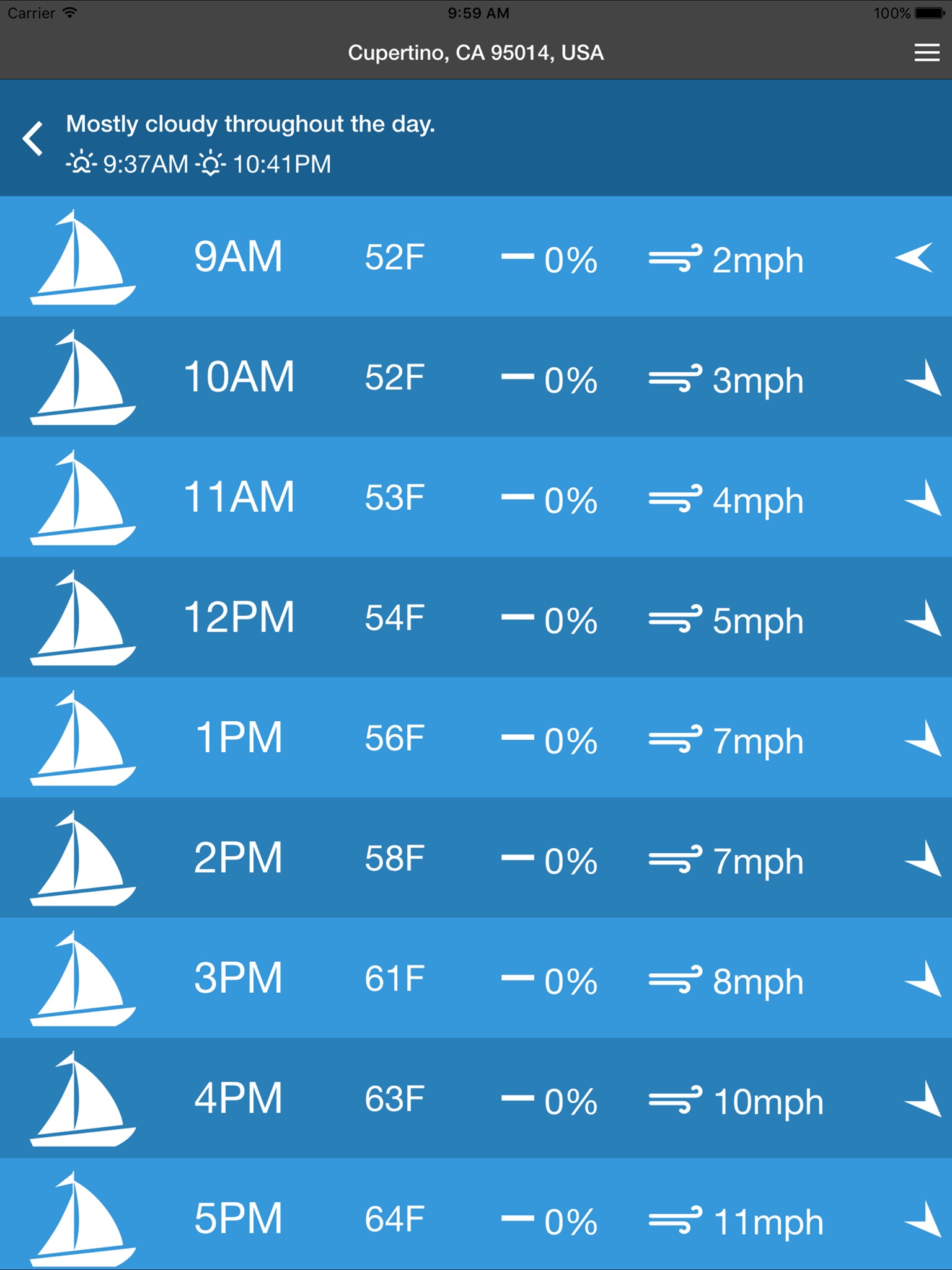 This app is really helpful, I love that I can set my weather preferences and see how the weather is forecasted to progress hour by hour - and it is usually accurate! Finally, a cheap weather app for sailors. My only suggestion would be to also list the speed of wind in knots, not only mph. Definitely download!