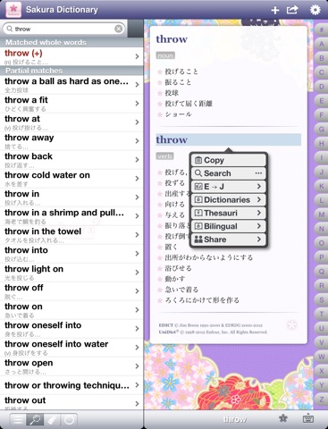 We have taken the deep and broad EDICT database and created the best Japanese English dictionary application on the iOS platform. Based on our 25 years of experience in digital dictionary development we have created a custom optimization of the EDICT data for our robust UniDict® dictionary engine.