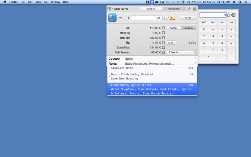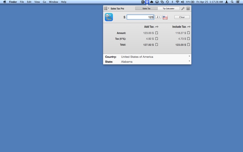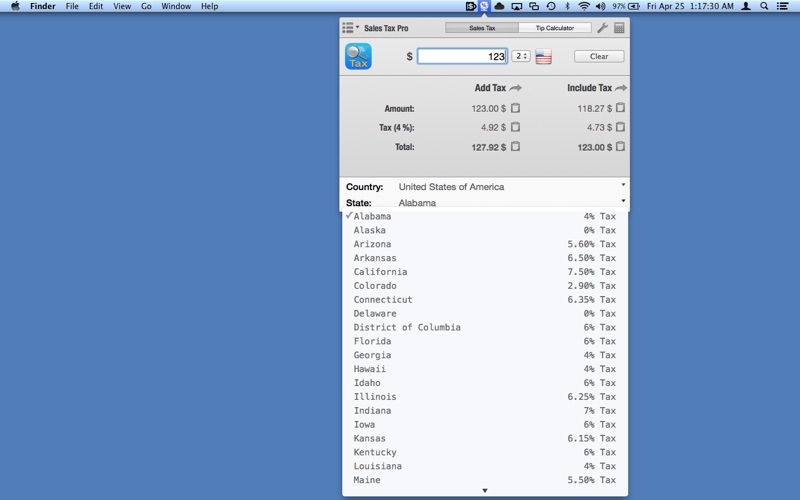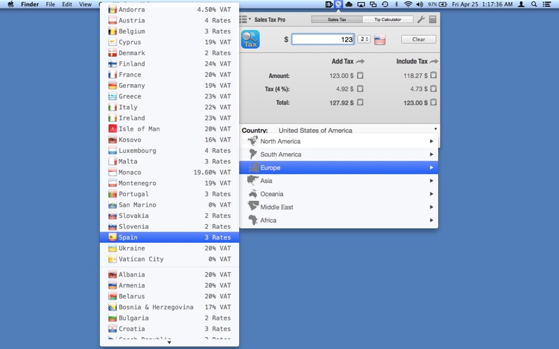 Sales Tax Pro organizes taxes by regions and multiple VAT rates are available for countries with more than one standard rate. Sales Tax Pro also includes a Tip Calculator to splitting restaurant bills easy and simple based on the Country and selected Tax rate, so you can keep track the exact price you pay for the food, material, book, transportation with the additional sales tax rate using Sales Tax Pro.