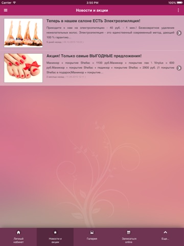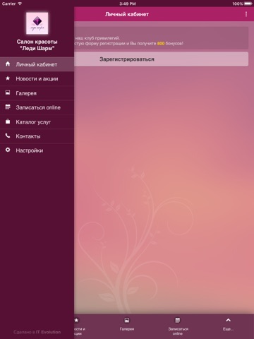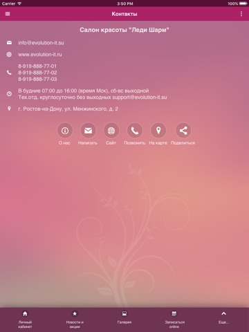Наше мобильное приложения для Вас - это Ваш личный кабинет в салоне красоты, Вы сможете записаться в наш салон в режиме online (в любое удобное для Вас время), узнать сколько у Вас накопленных баллов, получить дисконтную карту, будете в курсе событий салона (новости/акции), Вы сможете получать информацию об остатке услуг на абонементах и остатках ден.средств на сертификатах, а также об окончании их срока действия. Салон красоты «Леди Шарм» – гарантия высокого уровня обслуживания, все наши мастера проходят обязательное обучение в международных школах красоты, где бучение ведут преподаватели ведущих европейских школ: Vidal Sassoon, SACO, Pivot Point и др.