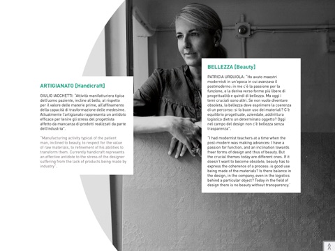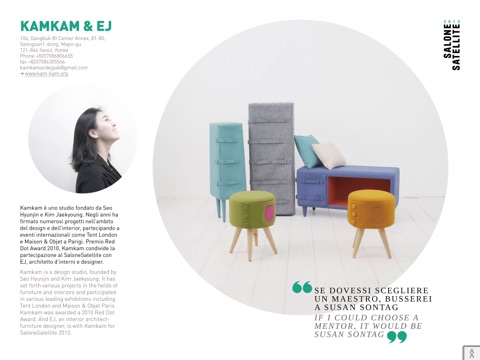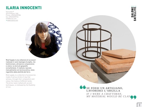 SaloneSatellite 2013 - “Design and Craftsmanship: Together for Industry” is the Catalog App of the unparallelled international observatory consecrated to the young creativity, during i Saloni, in Milan. A fascinating gallery of projects, conceived by the under 35s. The international schools of design. Four workshops that speak the language of craftsmen, of those who have made possible what has become known to the world as Made in Italy. A dictionary written in collaboration with Enrico Bassi, Giulio Cappellini, Arturo Gismondi, Giulio Iacchetti, Johan Lindstén, Massimo Lunardon, Satyendra Pakhalé, Eugenio Perazza, Maurizio Riva, Patricia Urquiola. The fourth edition of SaloneSatellite Award. Appointments, services.