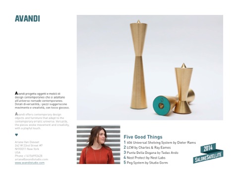 SaloneSatellite 2014 - “Design, Innovazione + Artigianalità” è il catalogo in App dellautorevole vetrina internazionale dedicata al talento under 35 che si svolge nell’ambito del Salone del Mobile.Milano. Una ricca gallery di progetti, volti e A-List dei protagonisti. Le scuole internazionali di design. Quattro botteghe parlano le lingue dell’artigiano, che hanno reso possibile quello che oggi è conosciuto nel mondo come il Made in Italy. I punti di vista di Paola Antonelli, Isabella Bossi Fedrigotti, Sebastian Herkner, Patrick Jouin, Massimiliano Messina, Chantal Prod’Hom, Aldo Provini, Paolo Ulian, Alberto Vignatelli. La quinta edizione del SaloneSatellite Award. Gli appuntamenti, i servizi.