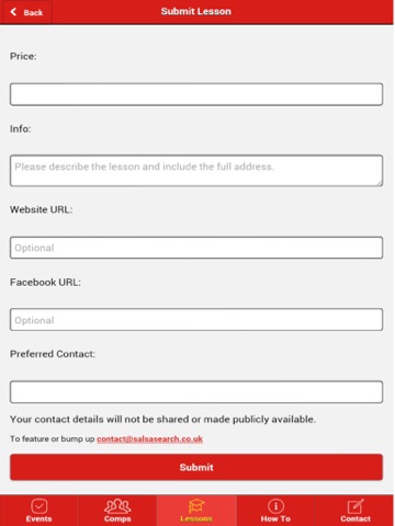 With the ability to submit your own event, competition or lesson/class this is the perfect opportunity to promote your event or service to the salsa community.