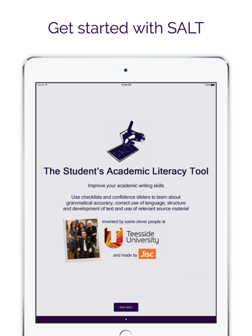 The Student Academic Literacy Tool (SALT) has been constructed to aid students in improving the standard of their academic writing at University. The tool is organised as a checklist, where students are able to learn about, gain confidence in and tick off each of the criteria needed to attain a standard of writing that will be accepted within University. We recognise that within University, there are a number of students with a range of abilities and we hope to have covered as many of these abilities as possible.