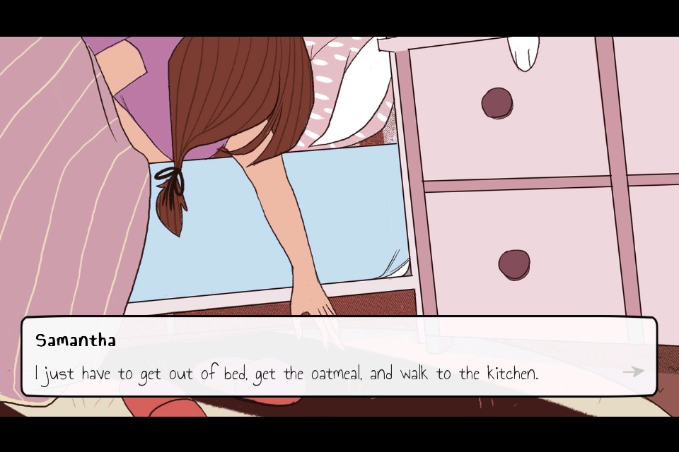 The Average Everyday Adventures of Samantha Browne is an interactive story about a painfully introverted college student who needs to make oatmeal in the communal kitchen of her dorm.