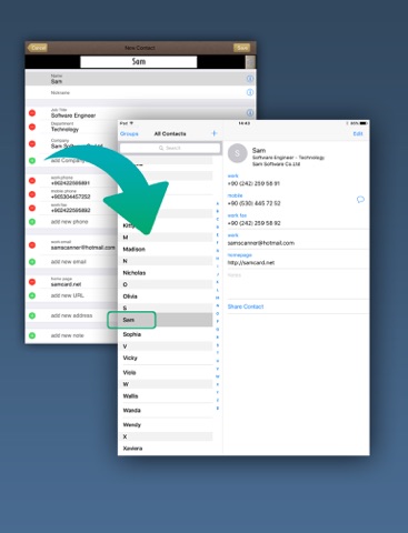 (Name, Job Title, Company, Department, Tel. …) is automatically recognized and go to iPad Contacts.