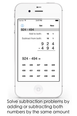 In the Same-Change Subtraction app the user can keep adding or subtracting the same amount from both numbers until the subtraction problem can be solved easily.