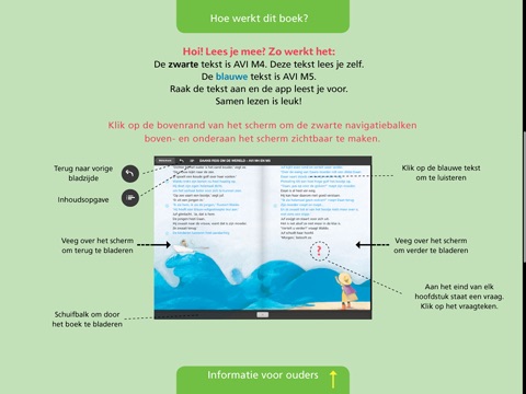 Deze app is gemaakt om samen te lezen. Het kind leest de zwarte tekst (AVI M4). De voorleesstem in de app leest de blauwe tekst (AVI M5).