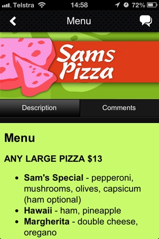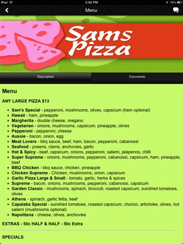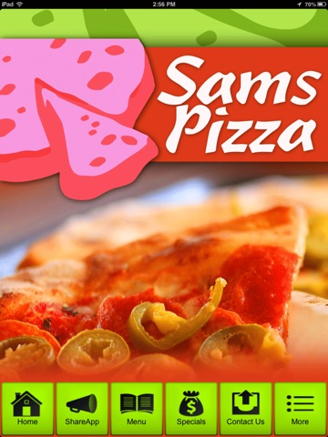 Download our free App to read more about us and our menu. You can also order online, make enquiries, read and leave reviews, submit a photo of your Sams Pizza for our online galleries, track and attend our latest events of interest.