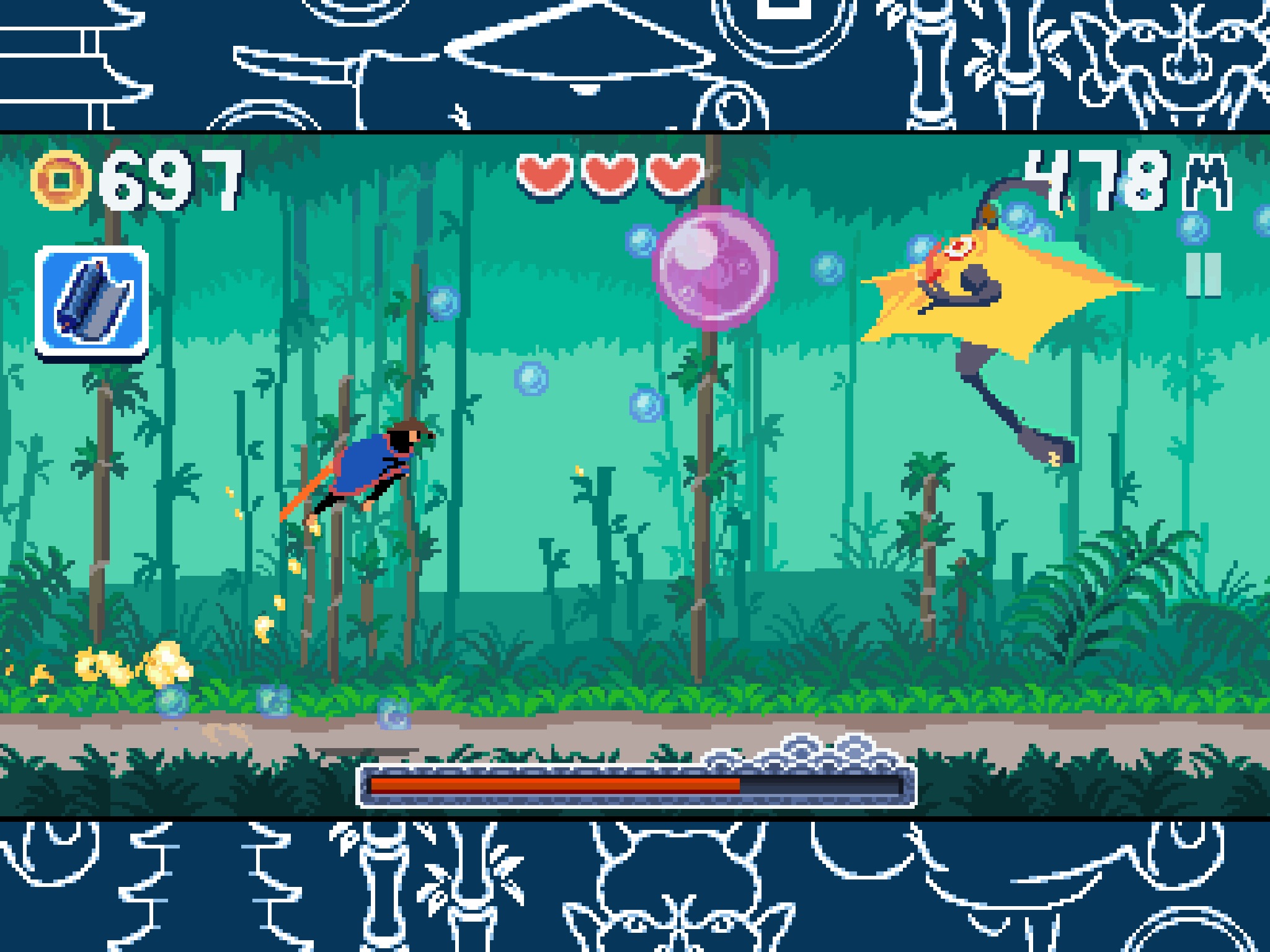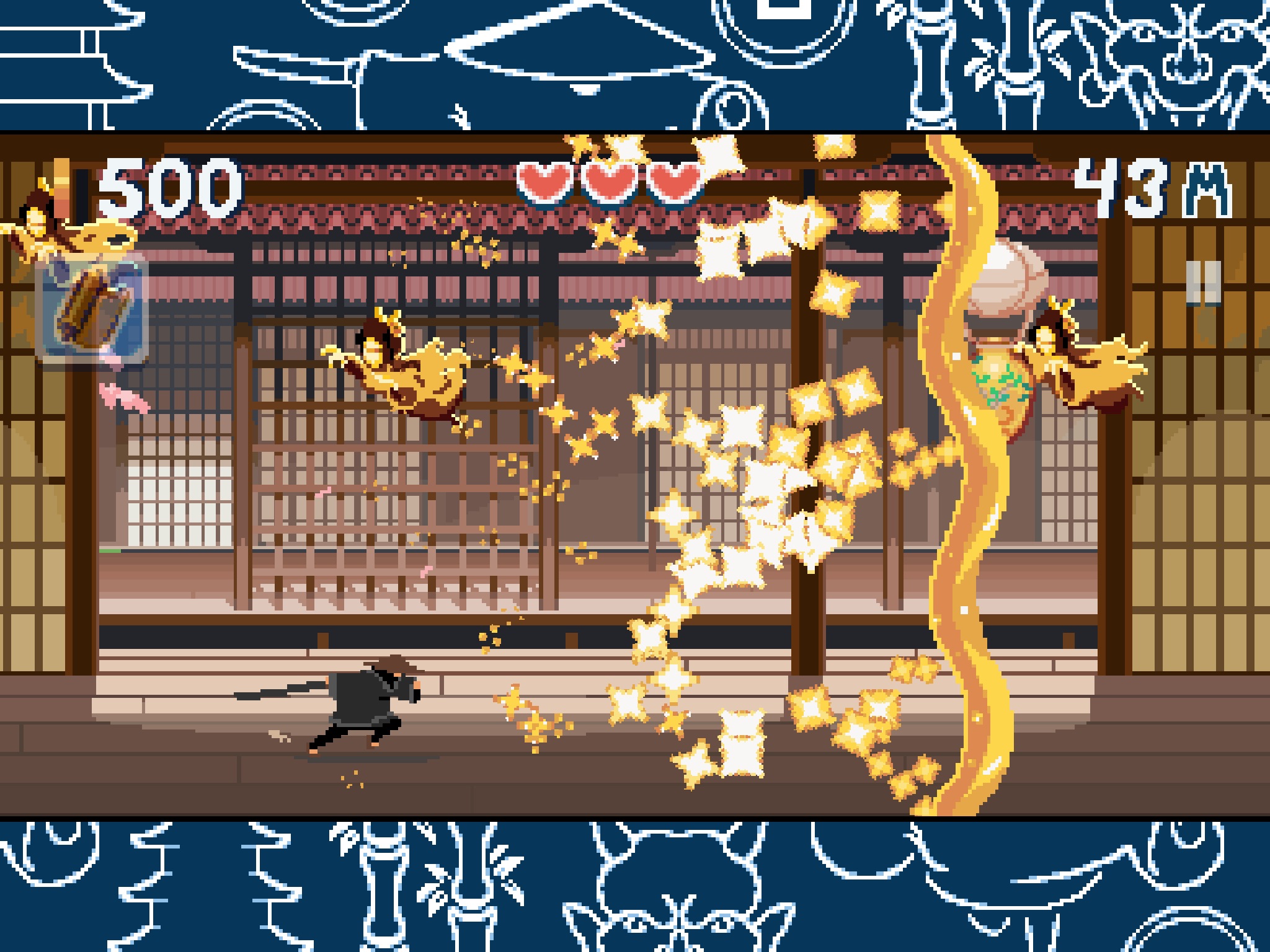 Buy new katanas, scrolls, pets and much more from the market (With in-game coins) to power up your runs in however you see fit. Losing too many hearts? Theres a katana for that! Finding it hard to jump over pits? Theres a scroll for that too! In fact theres just about everything you can think of to aid you for your perfect run, so choose wisely, equip smartly and decimate ruthlessly.