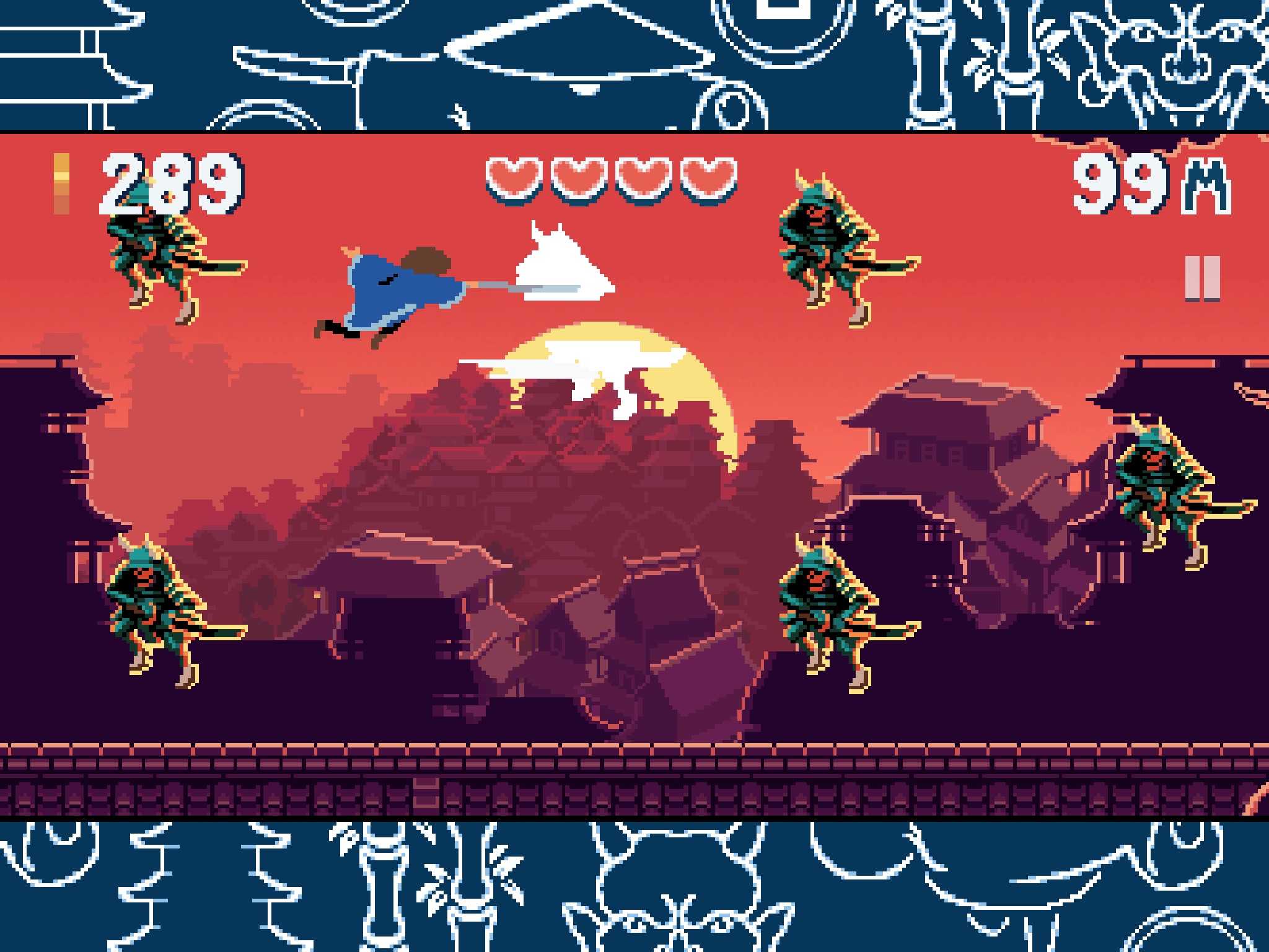 Dash your way through 8 beautiful pixel-drawn environments whilst slicing and dicing as many enemies as possible. Chain together combos to receive bigger and better rewards from each enemy you slay, but watch out for the projectiles coming towards you, they hurt! The further you run, the harder it will become, although the rewards will be much more fruitful as chaining combos becomes a key element in staying alive.