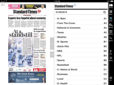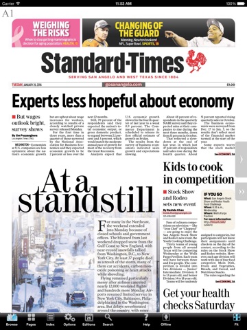 The San Angelo Standard Times eEdition lets you read San Angelo Standard Times on your iOS device just as it appears in print. You can flip through pages and skim headlines as you would the printed edition. But better than that, the San Angelo Standard Times eEdition allows you to enlarge type with the tap of a finger, or jump instantly to the conclusion of a story on another page. You can link to websites mentioned in stories with a single touch, or fire off an e-mail to an address linked from the newspaper. And if you missed the paper one day, dont worry. The San Angelo Standard Times eEditions lets you download past editions, too.
