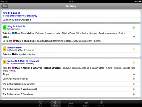 Comprehensive details of your planned route are provided, including “direction”, “towards” and “service frequency” information (not available on any other offline journey planner) for example “Take the Muni N Judah line (Outbound) towards Judah St & La Playa St for 25 mins (21 stops). Service runs every 10 minutes” which is essential when finding the correct platform and direction. Also given are alternatives for each leg of the journey.
