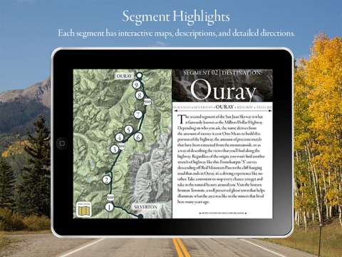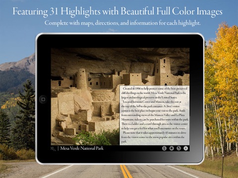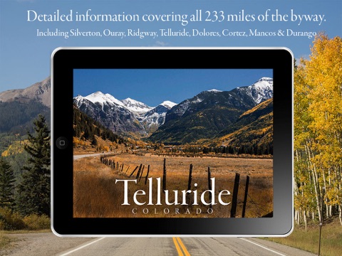 This app will guide you along your journey through the towns of Silverton, Ouray, Ridgway, Telluride, Dolores, Cortez, Mancos, and Durango. Each segment highlights stops along the way that shouldnt be missed. Beautiful photographs (many of which have direct links for purchase), insightful descriptions & information, and maps & directions are displayed for all 31 highlights.