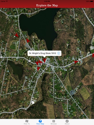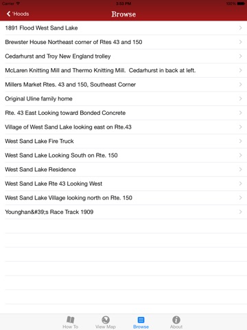 Make your way to Sand Lake. Open the "Sand Lake: Then & Now" app on your mobile phone and click on the "View Map" button. On the map you’ll see red arrows which represent historical photographs in our collection. Each arrow shows where sometime in the past a photographer stood and took a picture of the towns landscape.