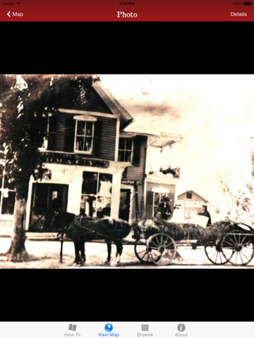 On the map, press the red arrow. Voilà! The image that you’re seeing is exactly what the photographer saw years ago while standing in the same location! For more details about the photograph, press the "Details" button.