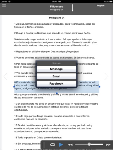 - Compartir versículos con los contactos por: Correo, SMS, Facebook, Twiter, etc.