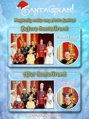 With the tap of a button, SantaGram! instantly makes any photo festive and fun! Just take a picture or pick one from your photo library, and SantaGram! will magically find people in the photo and put Santa hats, reindeer horns and noses, elf ears, or a bunch of other fun things right on their heads. Just swipe to the left on the picture and the hats and such will all re-shuffle for another new funny Christmas picture.
