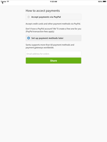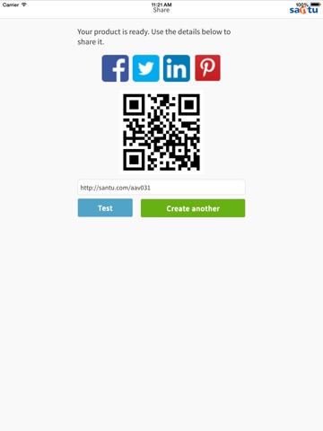 Start selling in just 20 seconds - via your Facebook account, website, Twitter, Pinterest and more. With Santu you can sell your product anywhere you want. Even in printed magazines or via SMS.