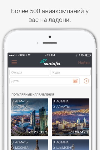 Santufei - казахстанский онлайн сервис поиска, бронирования и покупки дешёвых авиабилетов. На Сантуфей вы сможете найти самые выгодные тарифы на рейсы более 700 авиакомпаний мира без комиссий и скрытых сборов. Оплата доступна банковскими картами Visa/Maestro/MasterCard, в кабинете интернет-банкинга Homebank/Kaspi, а также через Qiwi терминал.