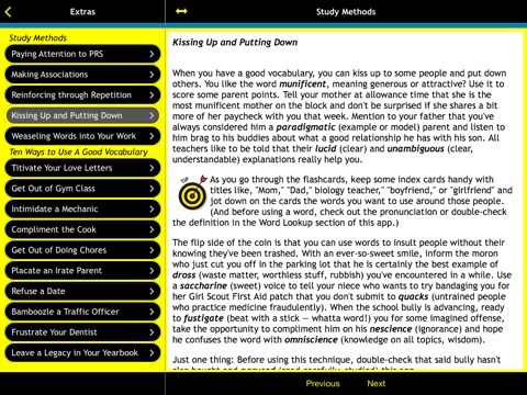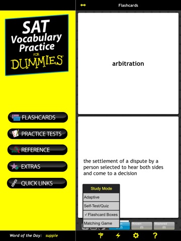 The SAT Vocabulary Practice For Dummies App focuses exclusively on the vocabulary you need to optimize your verbal score on the SAT exam. You’ll quickly increase your vocabulary with flashcards, practice tests, word lookup, and the ever popular Word of the Day. Discover fun ways to incorporate new vocabulary into your daily routine, such as getting out of gym class or chores, placating an irate parent, refusing a date, bamboozling a traffic officer, or leaving a legacy in your yearbook. This app features proven study methods, such as making associations, repetition, and paying attention to prefixes, suffixes, and roots of words. Whether you have weeks or just days before the test, SAT Vocabulary Practice For Dummies App will build your vocabulary and boost your test scores.