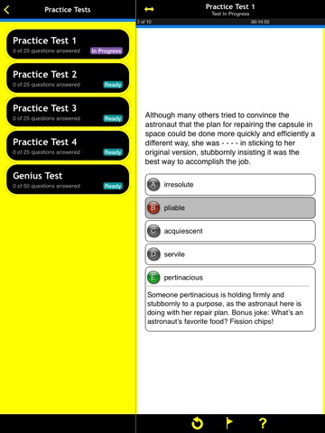 Four, real-world practice tests give you a feel for what to expect on the test. The customizable practice tests offer 25 questions each and illustrate the meaning of words by placing them in the context of a sentence—usually through humorous stories. The ability to flag questions and then review only those questions gives you practice on what you need the most. Plus, detailed explanations are provided for each correct answer. Automatic scoring at the end of each test lets you easily track your progress. And you can review all the answers at the end of each test or just the ones where you got the answer wrong. An exclusive Genius Test with 50 questions challenges even the most gifted vocabulary student.