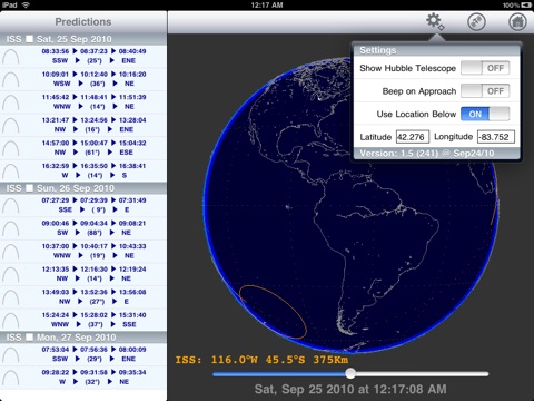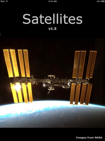 Satellites is an iPhone/iTouch/iPad application that displays the location of the International Space Station (ISS) as it orbits the Earth. The data used is downloaded from up-to-date NORAD and NASA sources so it is as current as it can be. The algorithms used for the orbit predictions are also current, being the latest revisions of the NORAD three-line element SGP software republished in 2006.