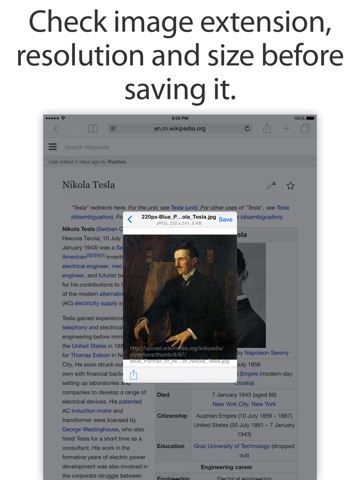 Before saving an image, you can see the image extension (MIME type), pixel resolution and data size. Zooming is also available.