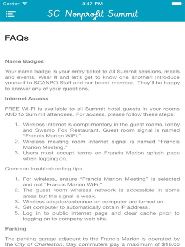 This app is an interactive tool made possible by the South Carolina Association of Nonprofit Organizations for its members, business partners and the greater nonprofit community within the state of South Carolina. A primary component of this app is mobile app functionality geared toward attendees of the annual SC Nonprofit Summit. Future plans for this app include public policy updates, job opportunities, training calendar and more.