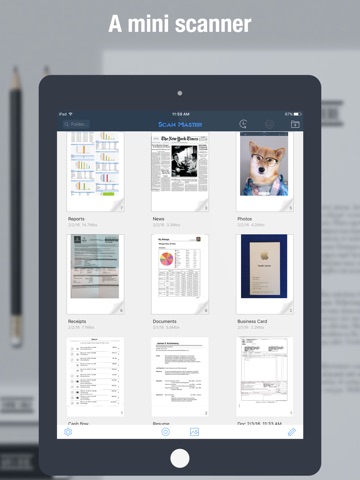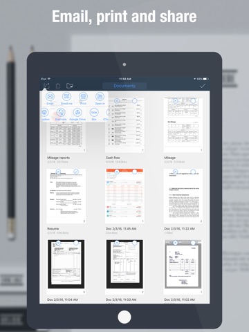 Quickly scan photos, receipts, name cards, invoices, documents etc, save them as single or multipage PDF or JPEG files, share by email, upload to Dropbox, Google Drive, Box and EverNote, or download to a pc, and even print the files directly.