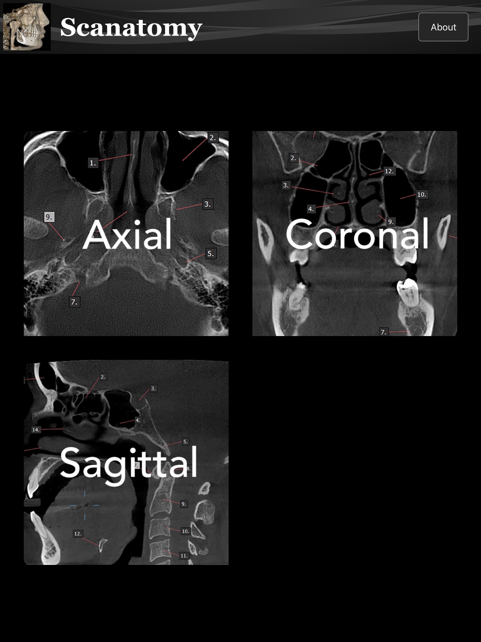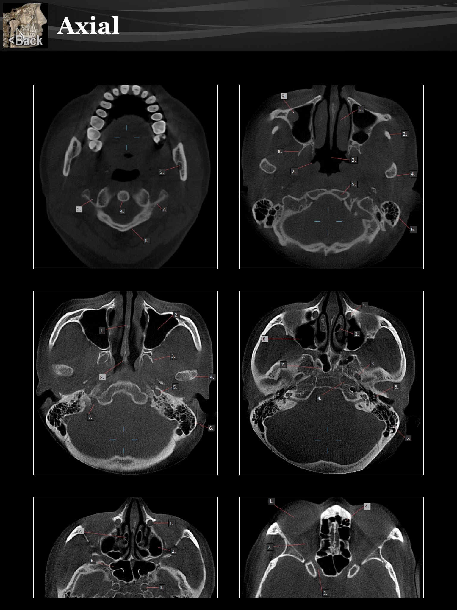 This fun, educational application teaches you the major anatomic landmarks that you will see in your 3-D cone beam scans. In each plain of section you are challenged by multiple images to identify the landmarks in a multiple-choice, quiz format. Your progress is tracked and recorded and your results shown at the end of each plain of section image completed. By repeating the fun quiz several times youll soon master the anatomy that you will be seeing in all of your scans. Surprise yourself, have fun while you read, and learn your anatomy using this fun tool.