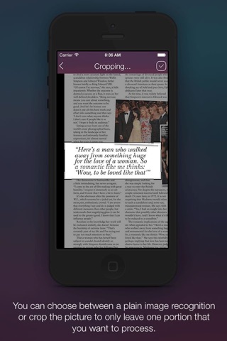 Snap a photo or choose an existing one from your library and the app will instantly extract your text from the picture.