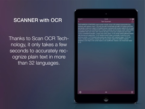 OCR Scanner just works as advertised. It use an advanced image-processing algorithms to eliminate uneven lighting and shadows and improve contrast. The result is the clearest and most readable scans possible from the iPhones camera.