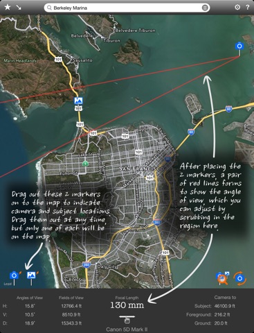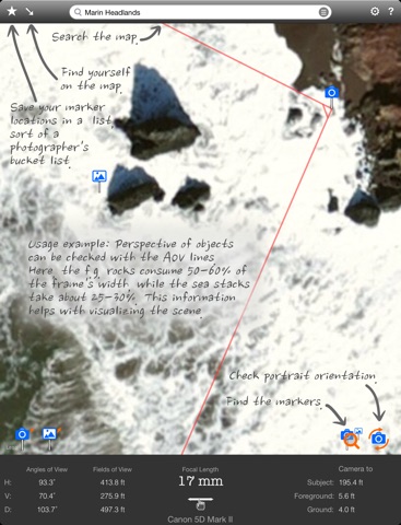 Often times, outdoor scape photographers will compose their images based on the lens at hand (nothing wrong with that). This tool offers the option to go the other way around - it will help them decide what lens (e.g. focal length) theyll need to create the landscape, seascape, or cityscape images they want. It allows them to experiment with different vantage points and framing to see subject placements, as well as whats in the background and foreground. This map-centric app is a photo compositional aid to supplement on-location scouting to answer the often asked questions of what focal length to use and where the shooting spot should be, before actually heading out.