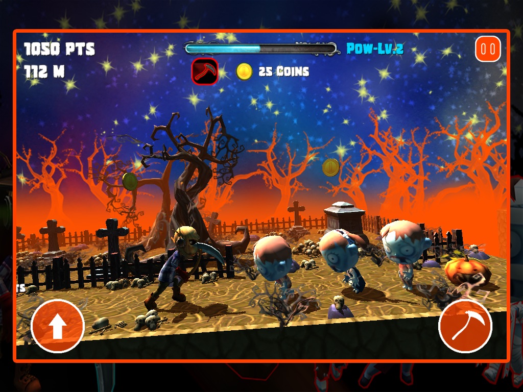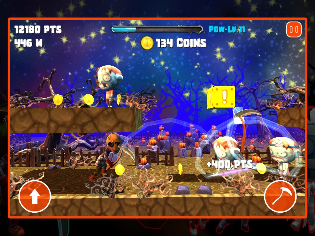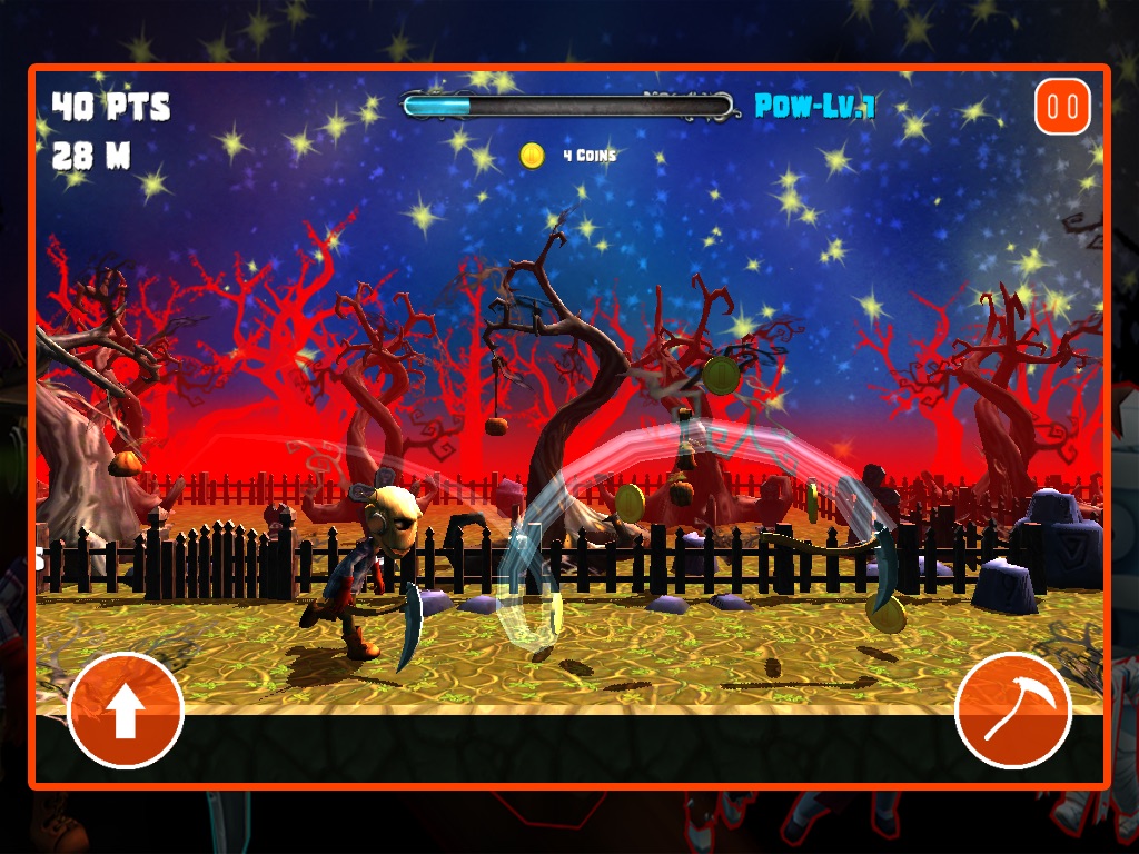 Run through the underworld land of the zombies and evil pumpkins, fight them using the powerful death scythes and try to escape from hell jumping between platforms while avoiding obstacles and the dangerous devils forks!!