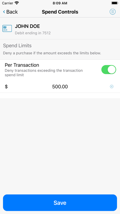 Set spending limits to decline transactions above your thresholds. Monitor activity by category such as gas stations and restaurants, and by type: in-store purchases, e-commerce transactions and ATM transactions.