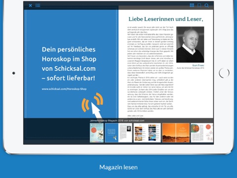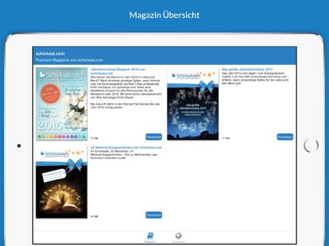 Der Online Kiosk von schicksal.com. Die große Astrologie, Horoskop und Esoterik Webseite schicksal.com veröffentlicht spannende Magazine und Bücher, die in dieser App gekauft und gelesen werden können.