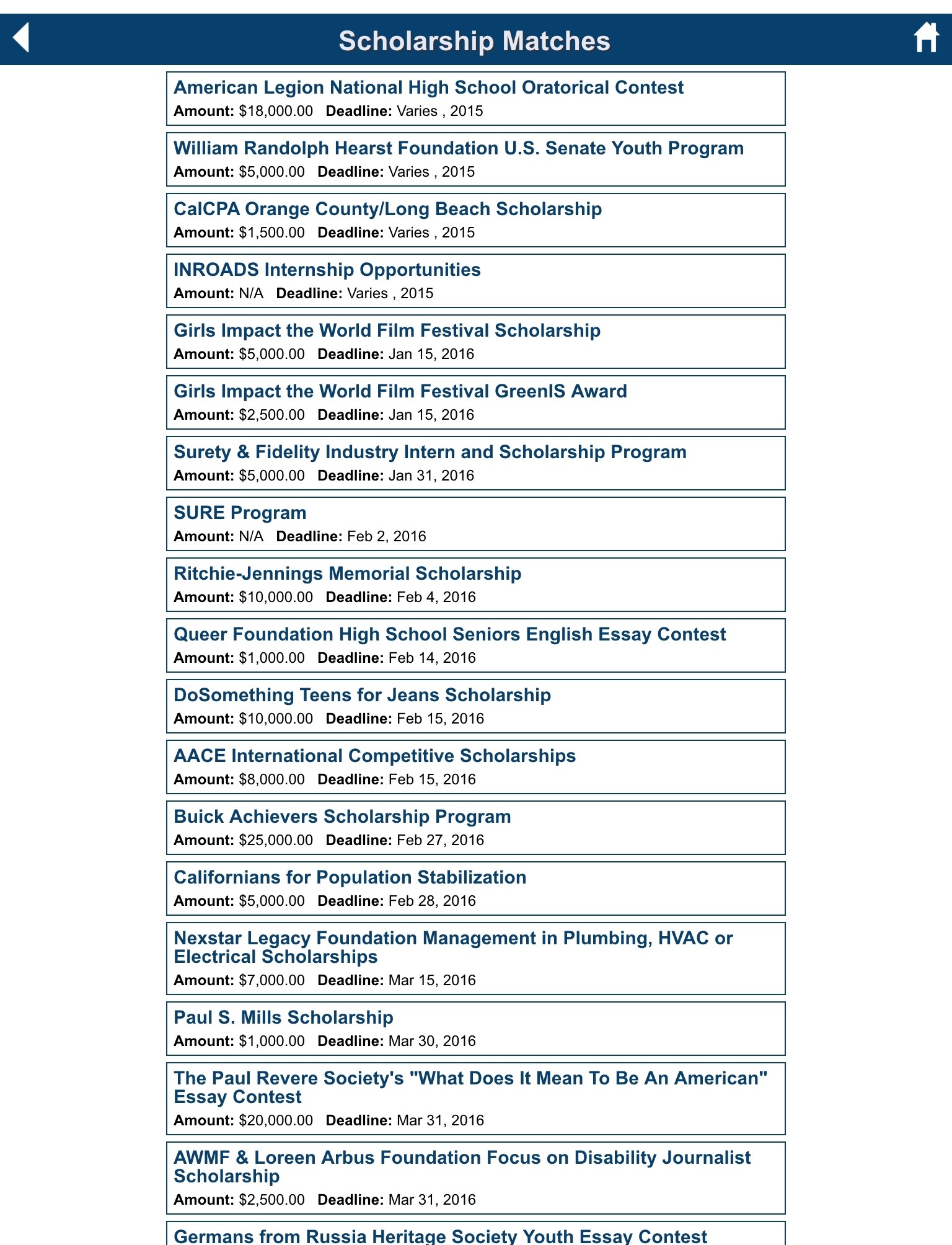 Its great for searching scholarships rapidly, but these are ways it can be improved: 1) It requires me to log in every time even when I click "keep me logged in". 2) How about ways to sort scholarships--will apply, wont apply, applied, delete. 3)Add a save or favorite button. I need the app to let me know which apps Im interested and qualified in applying to, by it letting me SAVE the scholarship!