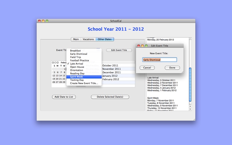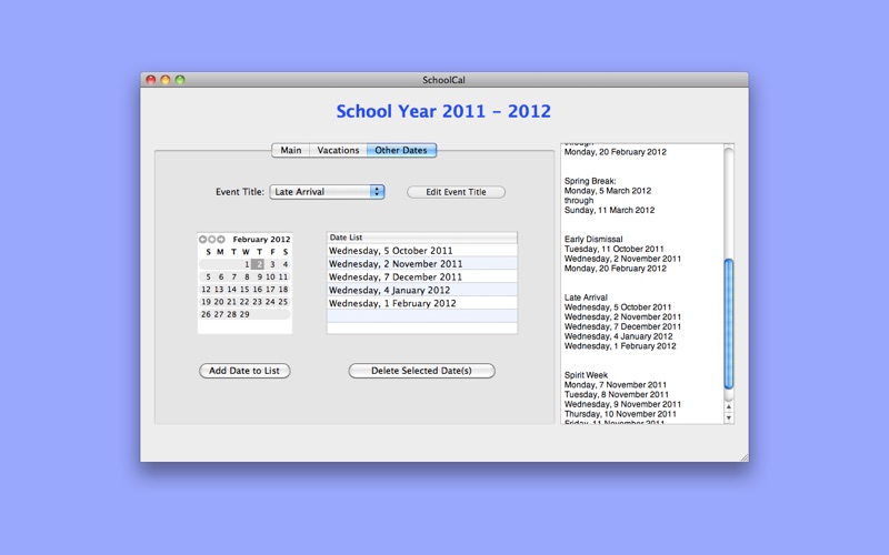 In either a single session, or multiple sessions, you can create iCal Events for all the major vacation periods (Thanksgiving, Christmas, Midwinter, Spring), as well as schedule Snow Days, Late Arrival Days, No School Days, Conference Days, or whatever other type of school-associated event you wish. No data is lost in between launches; you can take as long as you need to build the calendar data before committing it to iCal.
