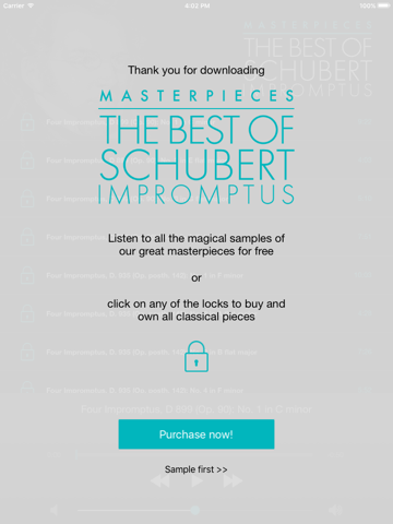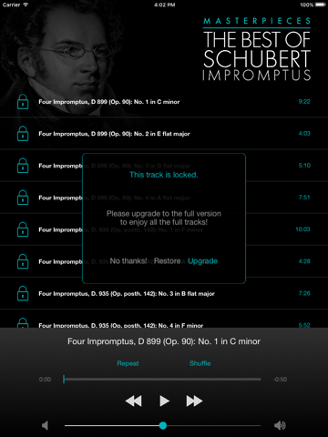The Best of Schubert: Impromptus collects the Composer’s most popular and best-known impromptus in a simple, easy to use iPhone and iPad optimized interface. 8 tracks of the greatest performers from one of the greatest masters of music history.