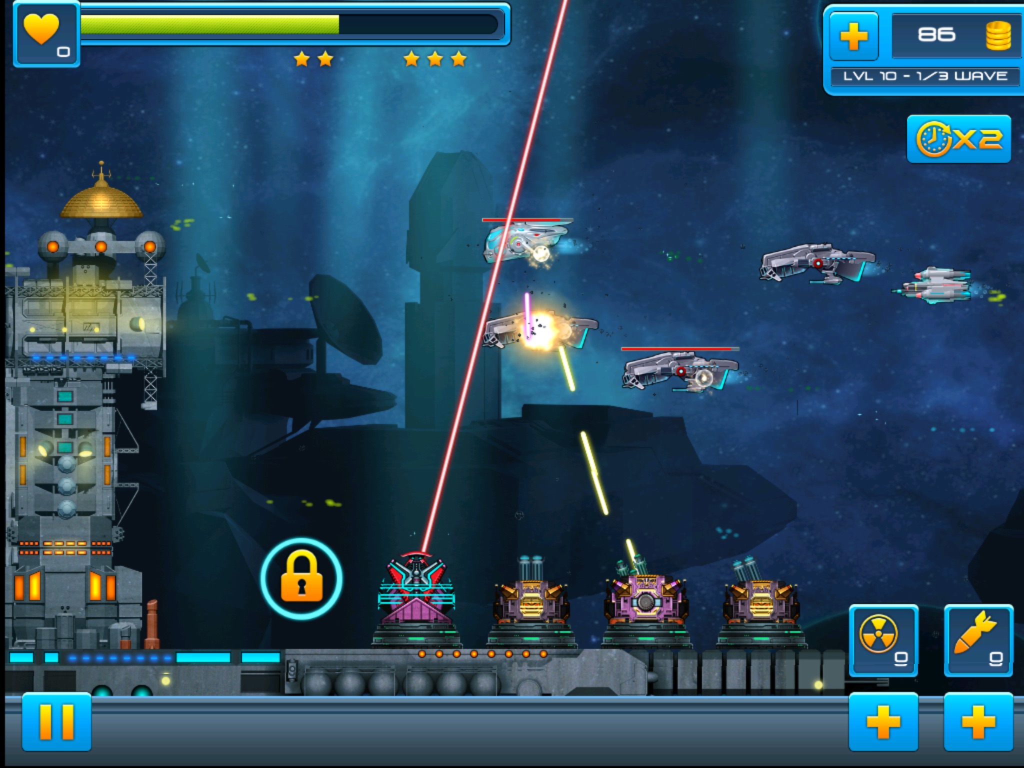 Build and upgrade towers by destroying enemy ships and try to defend your base