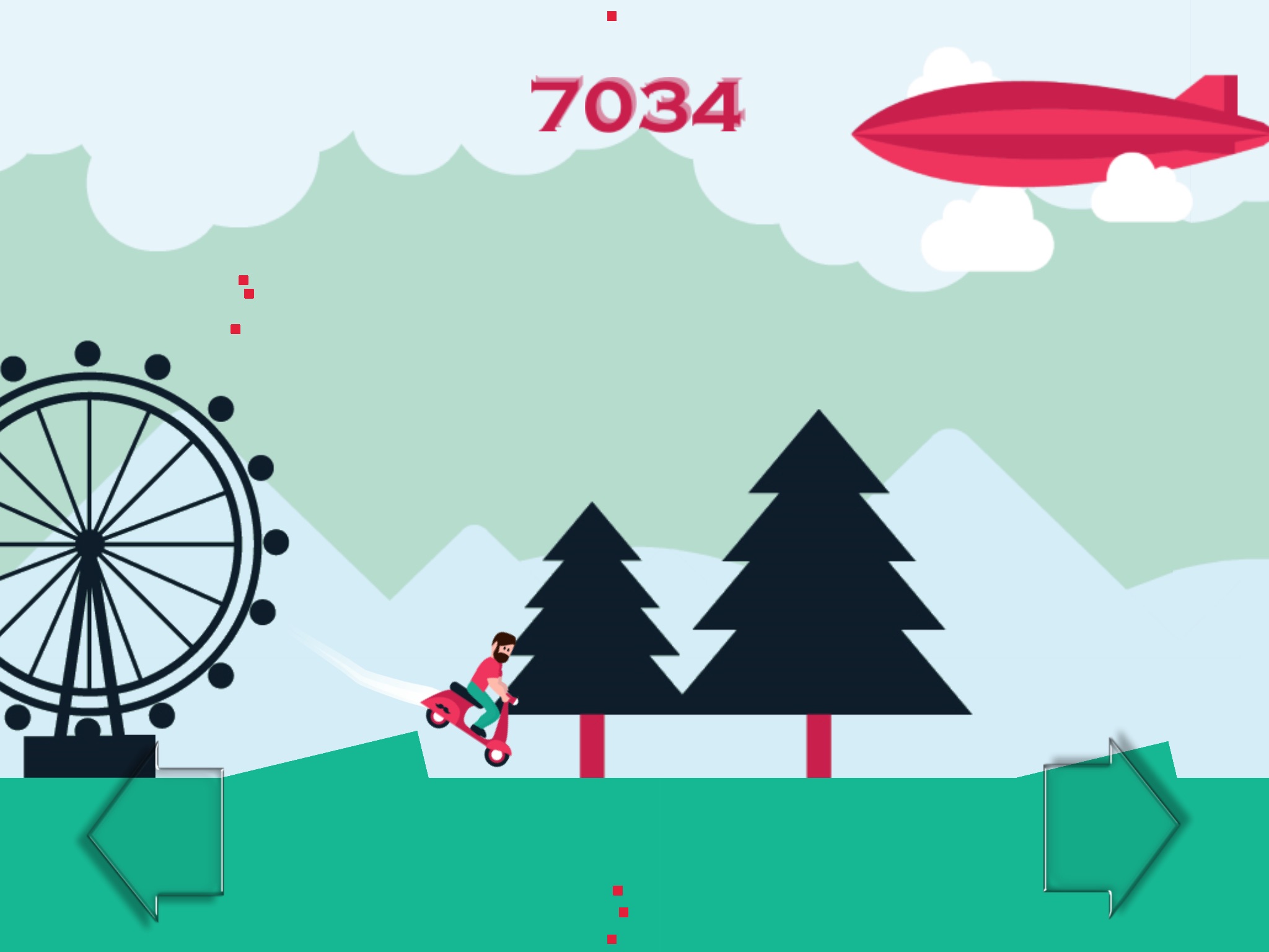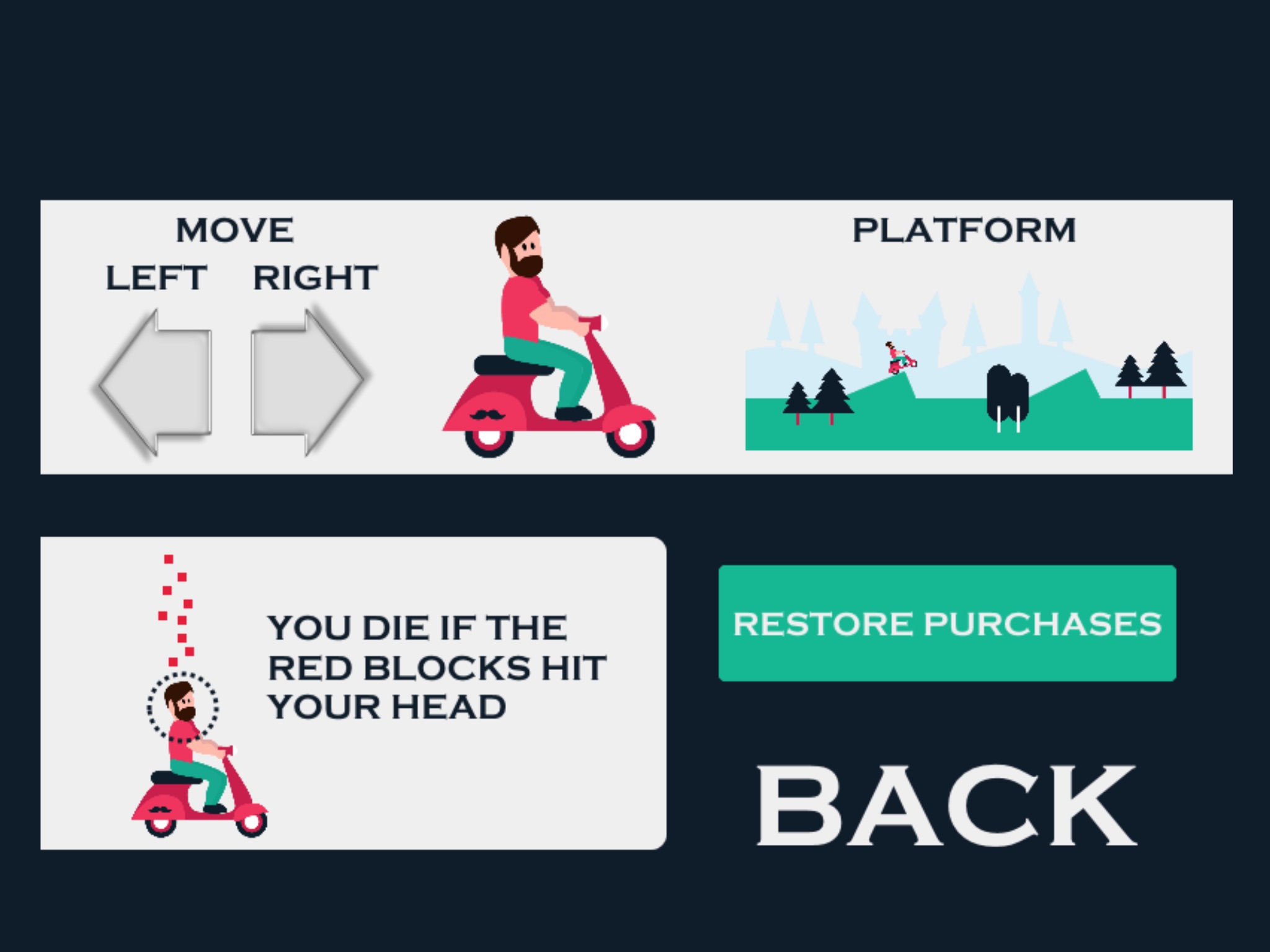 Stay on the platform as long as you can, avoid the red blocks by going back and forth using the arrows on the screen. Do your best to balance the scooter when jumping off hills, so you dont make a headspin and hit your head.