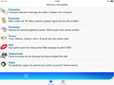 Cansado de ter um celular que faz tudo, até ligações, e na hora de jogar cartas ter que recorrer ao bom e velho papel e caneta? Pensando em você desenvolvemos esse aplicativo! Basta escolher o jogo e marcar suas pontuações! Serve tanto para os jogos de baralho como Canastra (Buraco), Escovão, Pontinho, Truco e Uno quanto para esportes, como Vôlei e Taekwondo. Vamos pontuar!